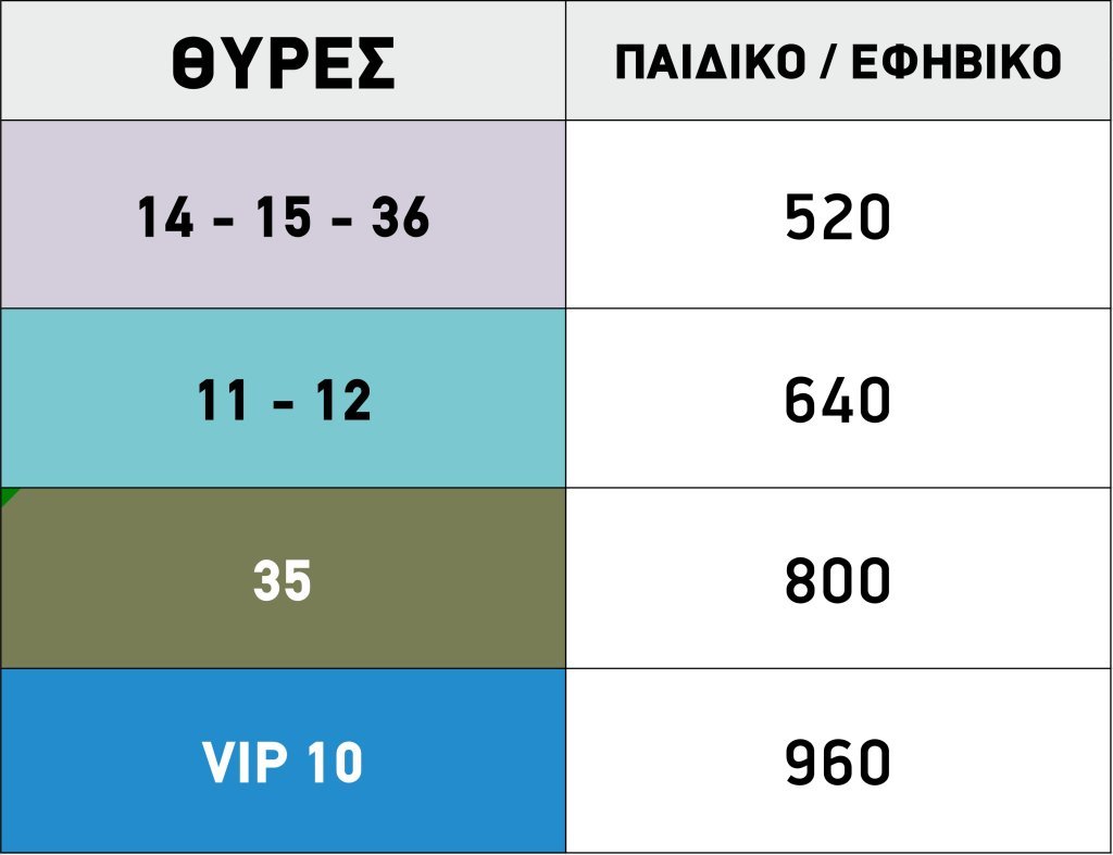 Τα εισιτήρια διαρκείας για το πρωτάθλημα και το Κύπελλο Ελλάδας κυκλοφορούν ακριβώς στις ίδιες τιμές με αυτές της περιόδου 2023-2024. Επιπλέον, οι κάτοχοι για τη σεζόν 2024 – 2025 θα έχουν το προνόμιο της προτεραιότητας για να αγοράσουν απλό εισιτήριο που θα αντιστοιχεί στη θέση του διαρκείας τους για τους αγώνες των προκριματικών του Conference League 2024 - 2025.