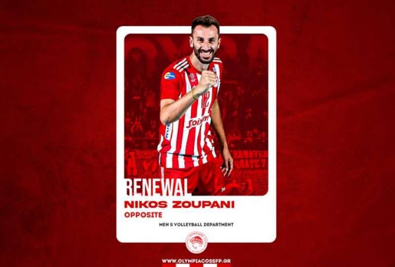 Ο 35χρονος διαγώνιος, Νίκος Ζουπάνι, υπέγραψε νέο συμβόλαιο και ανανέωσε με την ανδρική ομάδα βόλεϊ του Ολυμπιακού. Η επίσημη ανακοίνωση έχει ως εξής: «Ο Ολυμπιακός Σ.Φ.Π. ανακοινώνει την ανανέωση της συνεργασίας του με τον Νίκο Ζουπάνη. Ο διεθνής διαγώνιος υπέγραψε το νέο του συμβόλαιο και παραμένει στο ρόστερ της ομάδας βόλεϊ Ανδρών του συλλόγου." Ο Νίκος Ζουπάνη που κάνει αποθεραπεία δήλωσε στην επίσημη ιστοσελίδα του Ολυμπιακού: