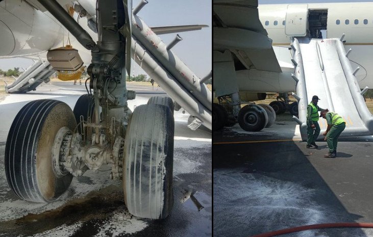 Fire broke out on the front landing gear of a Saudia plane in Pakistan, prompting passengers to evacuate using slides https://t.co/Ep8EPPuSDa pic.twitter.com/wiFZEGWYEi