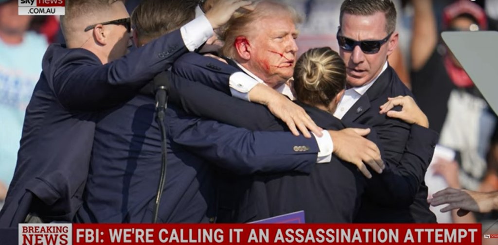 Ο Τραμπ εμφανίστηκε όρθιος ξανά περίπου ένα λεπτό αργότερα, με το καπελάκι του με το σύνθημα «Make America Great Again» να έχει πέσει, ενώ ακούστηκε να λέει προς τους πράκτορες «περιμένετε, περιμένετε», προτού υψώσει τη γροθιά του καθώς τον οδηγούσαν σε ένα μαύρο SUV. «Δέχθηκα μια σφαίρα η οποία διαπέρασε το πάνω τμήμα του δεξιού αφτιού μου», έγραψε λίγο αργότερα ο Τραμπ στο Truth Social. «Αιμορραγούσα πολύ». Αμέσως στελέχη των Ρεπουμπλικανών και των Δημοκρατικών καταδίκασαν την επίθεση κατά του Τραμπ.
