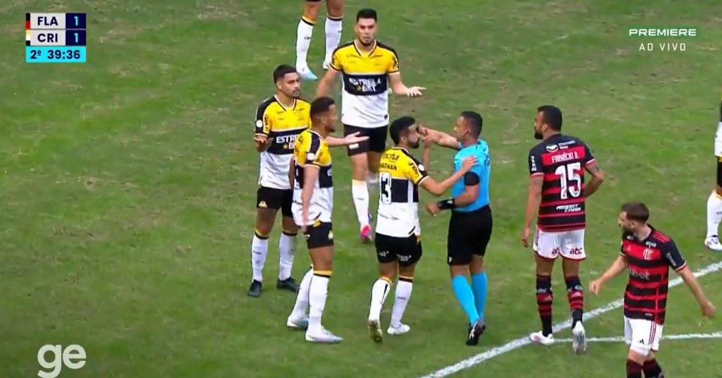 Já tinha visto um pênalti desse? Segunda bola em campo, jogador do Criciúma chutou-a na que estava em jogo. Falta. Dentro da área. Pênalti. Gabigol bateu e marcou para o Flamengo. pic.twitter.com/CgLYkxKFNN