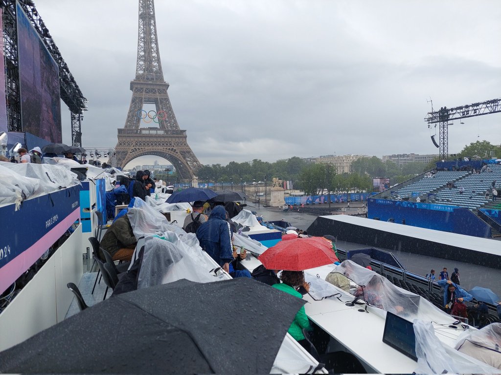 Η έντονη βροχόπτωση στο Παρίσι χάλασε το πάρτι που είχε οργανωθεί, στα πλαίσια της τελετής έναρξης, στο Τροκαντερό. Όμως, μετά την αποβίβαση τους από τις βάρκες, το μεγαλύτερο μέρος των αθλητών δεν παρέμειναν στον χώρο, προτιμώντας να αποχωρήσουν.