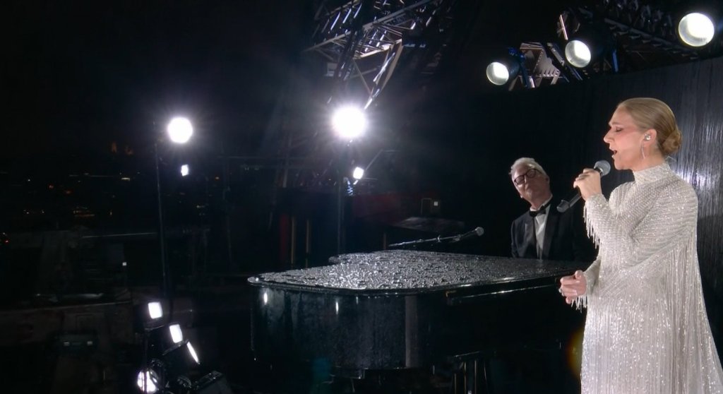 Η Ντιόν τραγούδησε με τη συνοδεία ενός πιάνο πάνω από τον Πύργο του Άιφελ το θρυλικό τραγούδι της Εντίθ Πιάφ, Ύμνος στην Αγάπη - L'Hymne à l'amour.