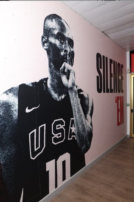 Η εθνική ομάδα των Ηνωμένων Πολιτειών στην είσοδο του ξενοδοχείου της στη Λιλ έχει μια τρομερή τοιχογραφία του Κόμπι Μπράιαντ από τις πιο ιστορικές του φωτογραφίες.