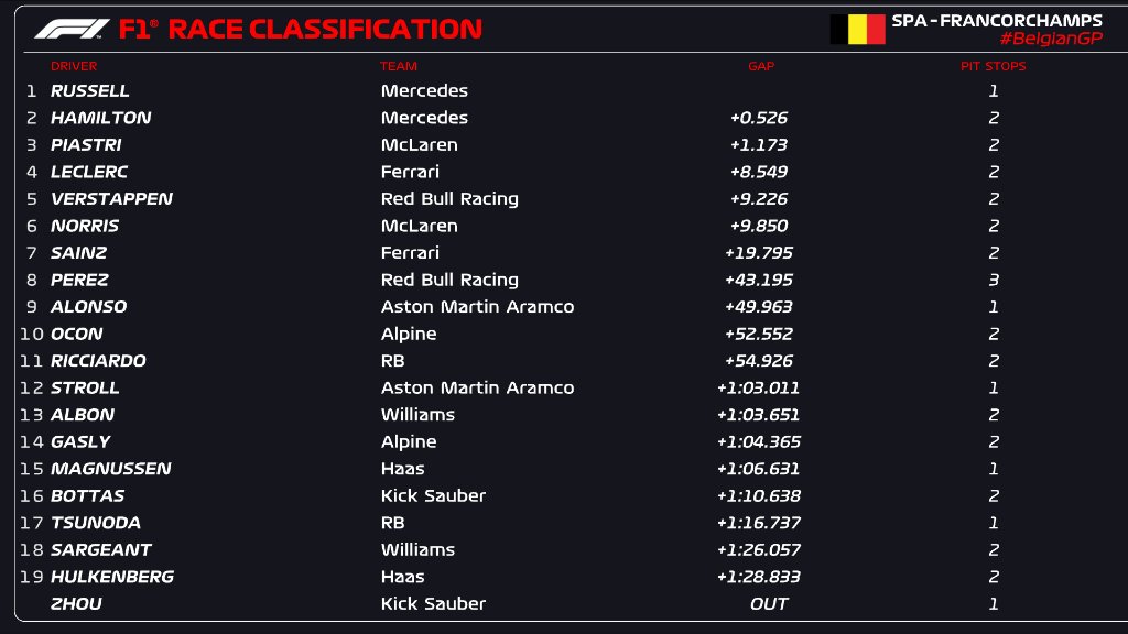 Ο Τζορτζ Ράσελ θριάμβευσε στο Grand Prix στο Σπα του Βελγίου, για το Παγκόσμιο Πρωτάθλημα της Formula 1, αφού πήρε τη νίκη, παρόλο που ξεκινούσε από την 6η θέση. Ο Βρετανός πιλότος έφερε τη Mercedes στην κορυφή, κάνοντας ένα pit stop μόνο, ενώ άπαντες έκαναν δύο και τελικά δικαιώθηκε με αυτή την στρατηγική. Μάλιστα, η γερμανική ομάδα έκανε το 1-2, αφού στη 2η θέση τερμάτισε ο Λιούις Χάμιλτον. Το βάθρο έκλεισε με τον Όσκαρ Πιάστρι (McLaren Mercedes).