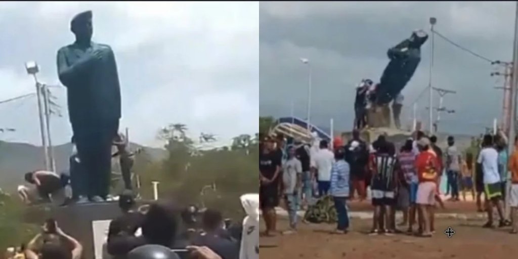 Βίντεο που αναρτήθηκαν σε μέσα κοινωνικής δικτύωσης δείχνουν διαδηλωτές στο Κόρο, πρωτεύουσα της πολιτείας Φαλκόν της Βενεζουέλας, να σκαρφαλώνουν στο βάθρο και να γκρεμίζουν το άγαλμα του Τσάβεζ εν μέσω επευφημιών και πανηγυρισμών από το πλήθος.