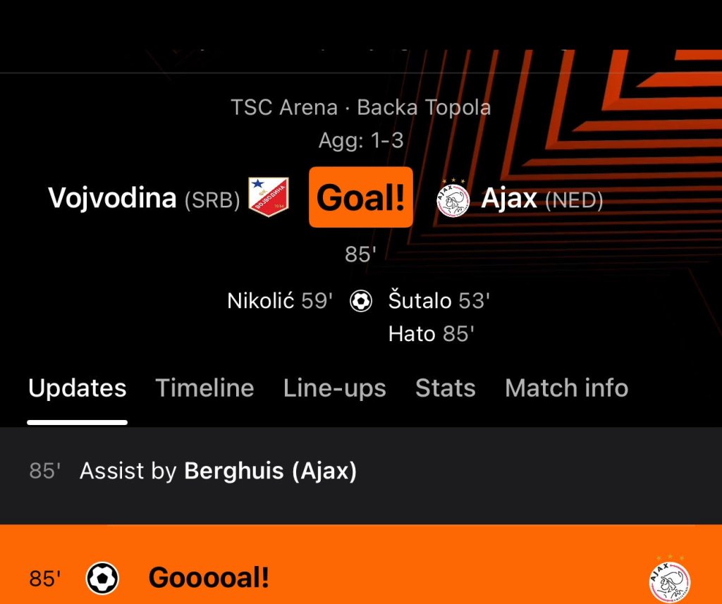 Βοϊβοντίνα-Άγιαξ: Στο 53' ο Σούταλο έδωσε το προβάδισμα στον "Αίαντα", ωστόσο στο 59' o Κροάτης αμυντικός έστειλε την μπάλα και στα δίχτυα της ομάδας του για το 1-1. Στο 85' ο Άγιαξ πήρε και πάλι το προβάδισμα στο σκορ(1-2) με τον Χάτο. Στο 90+2' οι φιλοξενούμενοι πετυχαίνουν και τρίτο τέρμα με τον Τραορέ(1-3) και κλειδώνουν την πρόκριση τους στον επόμενο γύρο του Europa League.