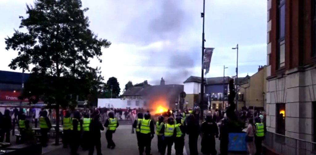 Διαδηλωτές που φώναζαν συνθήματα κατά των μεταναστών επιτέθηκαν με πέτρες εναντίον αστυνομικής δύναμης η οποία είχε αναπτυχθεί κοντά σε τέμενος της πόλης, πυρπόλησαν ένα αυτοκίνητο και προκάλεσαν πυρκαγιά δίπλα σε αστυνομικό τμήμα, όπως μεταδίδει το BBC.