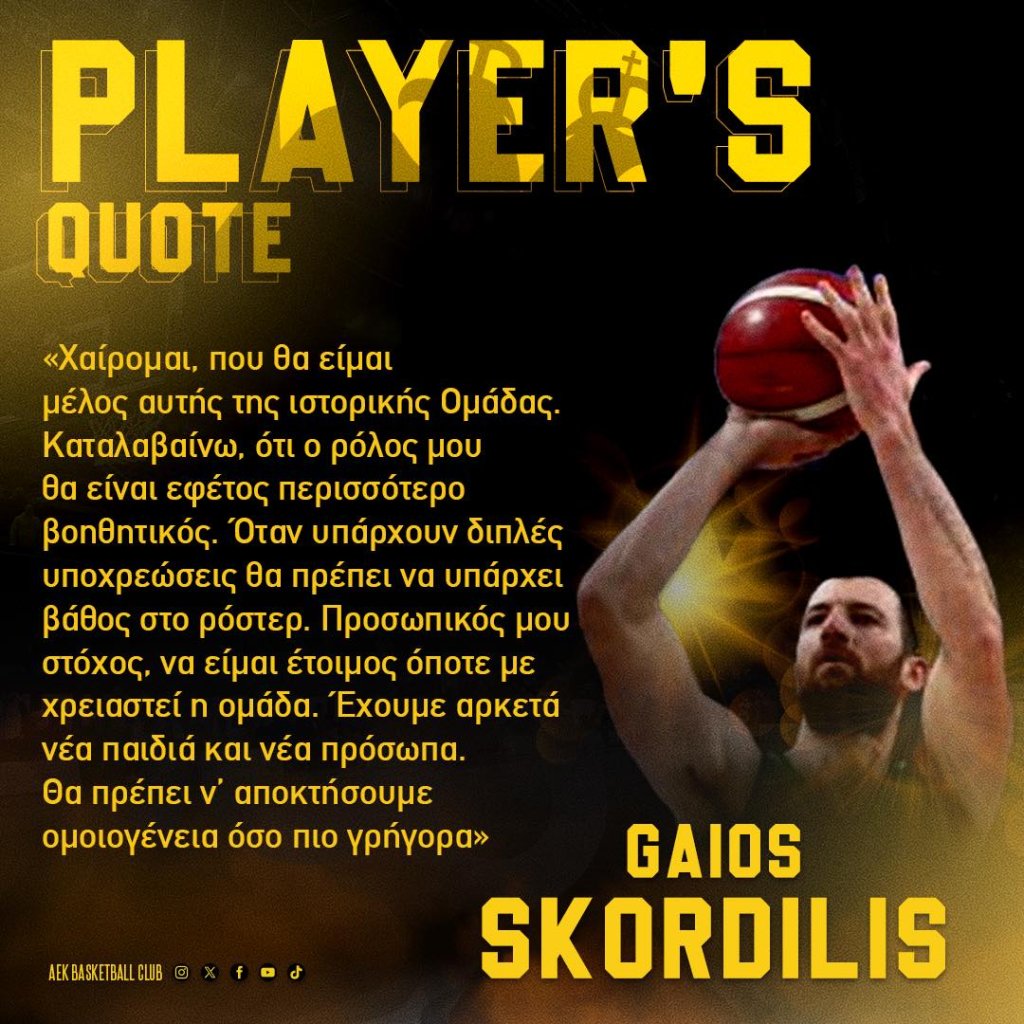 Η ΑΕΚ ανακοίνωσε επίσημα την απόκτηση του Γάιου Σκορδίλη, ο οποίος δήλωσε ευτυχής τονίζοντας: «Καταλαβαίνω ότι φέτος ο ρόλος μου θα είναι περισσότερο βοηθητικός. Όταν υπάρχουν διπλές υποχρεώσεις, θα πρέπει να υπάρχει βάθος στο ρόστερ», ανέφερε ακόμη και πρόσθεσε: «Προσωπικός μου στόχος είναι να είμαι έτοιμος όποτε με χρειαστεί η ομάδα. Έχουμε αρκετά νέα παιδιά και νέα πρόσωπα. Θα πρέπει να αποκτήσουμε ομοιογένεια όσο πιο γρήγορα γίνεται».