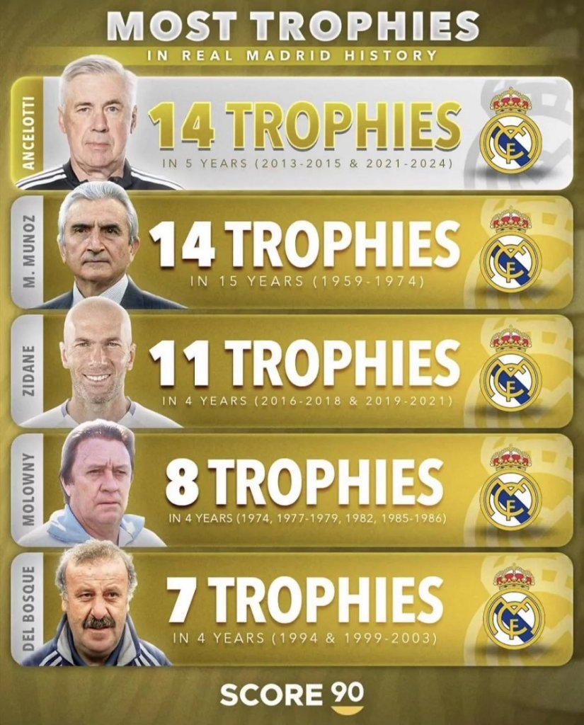 Ο Ιταλός τον έπιασε στα 14 τρόπαια σε πέντε μόλις χρόνια παρουσίας στο τιμόνι της Ρεάλ. Ακολουθεί στην 3η θέση ο Ζινεντίν Ζιντάν με 11 τρόπαια σε τέσσερα χρόνια, ο Λουίς Μολόουνι με οκτώ τρόπαια σε τέσσερα χρόνια, ενώ επτά έχει ο Βιθέντε Ντελ Μπόσκε σε τέσσερα χρόνια.