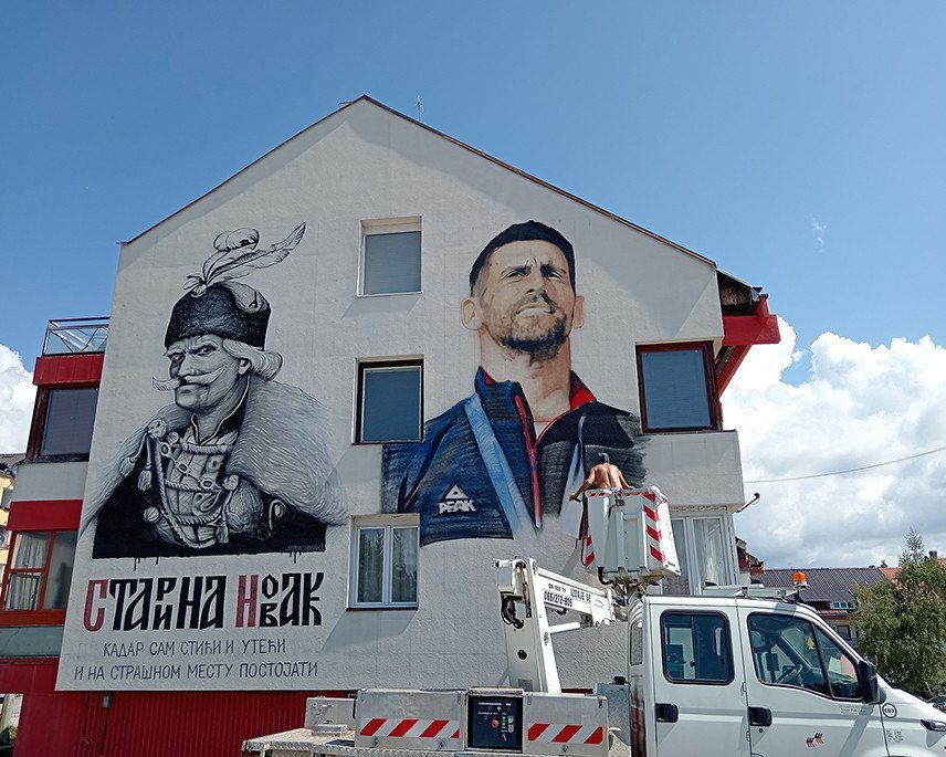 Η τοιχογραφία καλύπτει ολόκληρη την εξωτερική πλευρά του οικήματος και δείχνει τον Νόβακ Τζόκοβιτς με την φόρμα της Εθνικής Σερβίας να κρατά στο χέρι του και να δείχνει το χρυσό μετάλλιο που κατέκτησε στους Ολυμπιακούς Αγώνες στο Παρίσι.