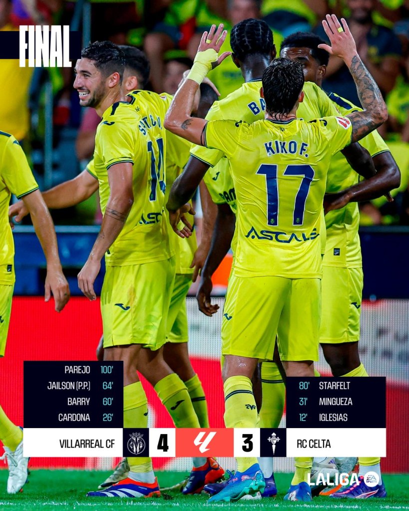 Σε ένα ματς-διαφήμιση για το ποδόσφαιρο στο «Θεράμικα», η Βιγιαρεάλ, χάρη σε γκολ του αρχηγού της, Ντάνι Πάρεχο στο 90+10’, λύγισε με 4-3 την Θέλτα, παρέμεινε αήττητη και πάτησε, έστω και προσωρινά κορυφή. Πέρασε ως αλλαγή στο 74' ο Τάσος Δουβίκας.
