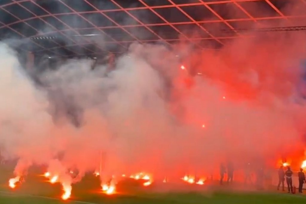 Συγκεκριμένα οι Κροάτες οπαδοί άρχισαν να ρίχνουν πυρσούς στον αγωνιστικό χώρο με αποτέλεσμα ο αγώνας να διακοπεί. Επενέβησαν και οι αστυνομικές δυνάμεις και σημειώθηκαν επεισόδια μεταξύ των δύο πλευρών.