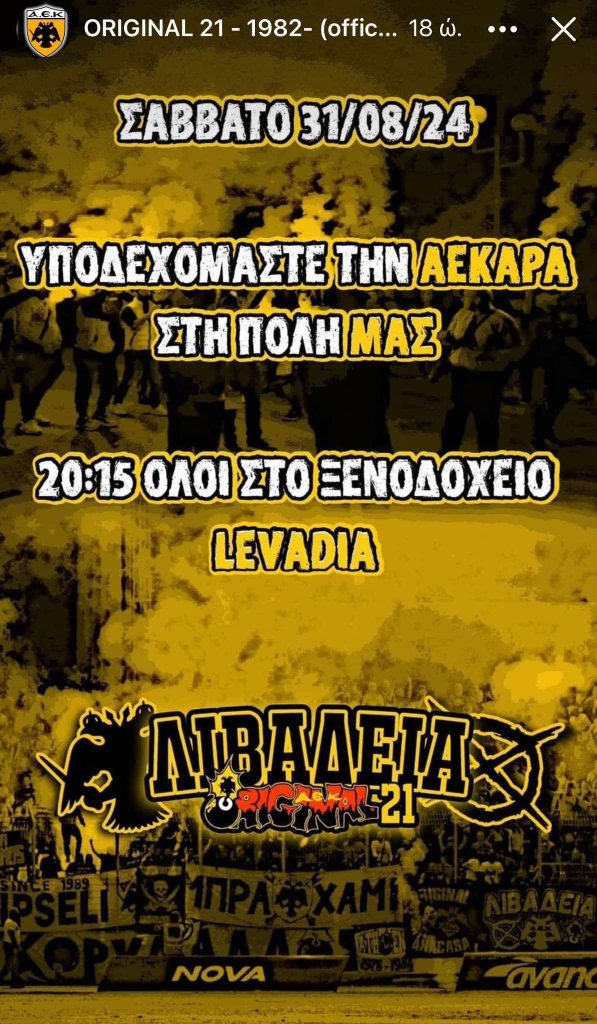 Υποδοχή στην ΑΕΚ ετοιμάζουν στη Λιβαδειά. Η αποστολή φτάνει απόψε στην πόλη της Βοιωτίας για τον κυριακάτικο αγώνα με τον Λεβαδειακό και το τοπικό κλαμπ αναμένεται να υποδεχτεί θερμά Αλμέιδα και ποδοσφαιριστές. Δείτε στην ένθετη φωτογραφία σχετικές πληροφορίες.