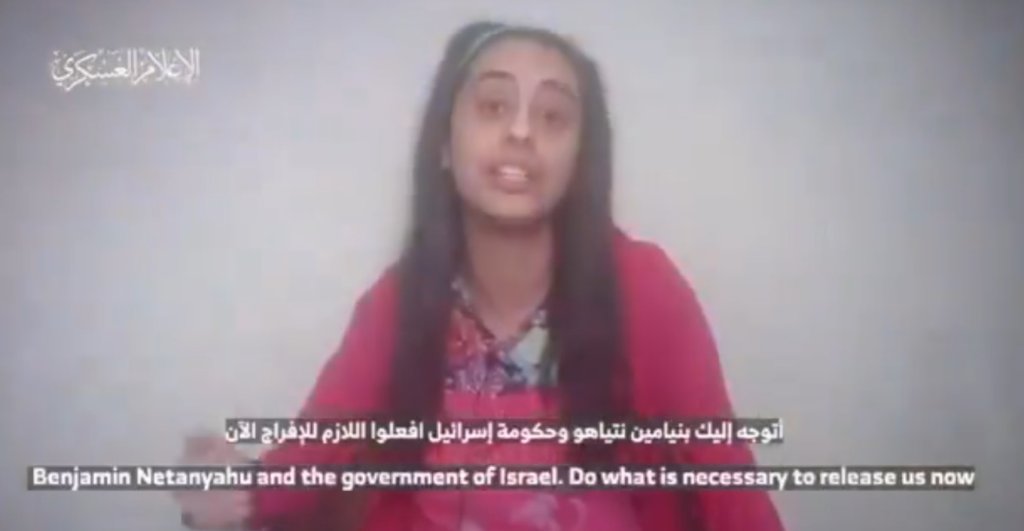 Στο βίντεο φαίνεται η 24χρονη, η οποία εργαζόταν ως μπαργούμαν στο μουσικό φεστιβάλ Νόα κατά την πολύνεκρη επίθεση της Χαμάς στις 7 Οκτωβρίου, να απευθύνεται, μεταξύ άλλων, στον πρωθυπουργό του Ισραήλ, Μπέντζαμιν Νετανιάχου, και να τον καλεί να κάνει ό,τι μπορεί για να τους ελευθερώσει. «Υποφέρω και υποφέρουμε όλοι» λέει η 24χρονη.