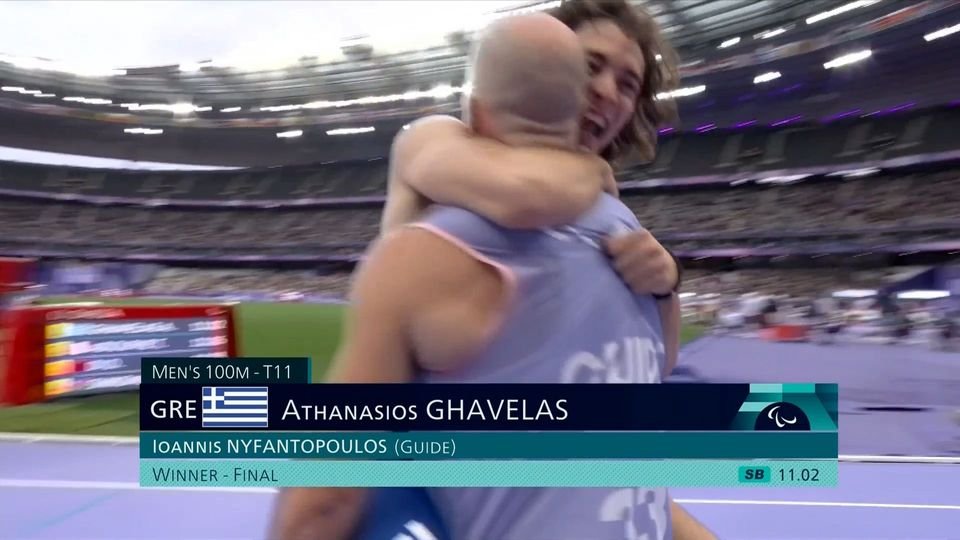Στον τελικό των 100 μέτρων Τ11, ο Νάσος Γκαβέλας, με οδηγό τον Γιάννη Νυφαντόπουλο, τερμάτισε πρώτος και οι δυο τους περίμεναν, με μεγάλη αγωνία, την επισημοποίηση του αποτελέσματος.
