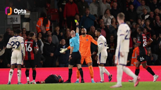Συγκεκριμένα, πρόκειται για το ματς της Premier League με τις περισσότερες κίτρινες κάρτες. Για την ακρίβεια, ο διαιτητής Άντονι Τέιλορ έδειξε κίτρινη σε 14 ποδοσφαιριστές, έξι της Μπόρνμουθ και οκτώ της Τσέλσι.