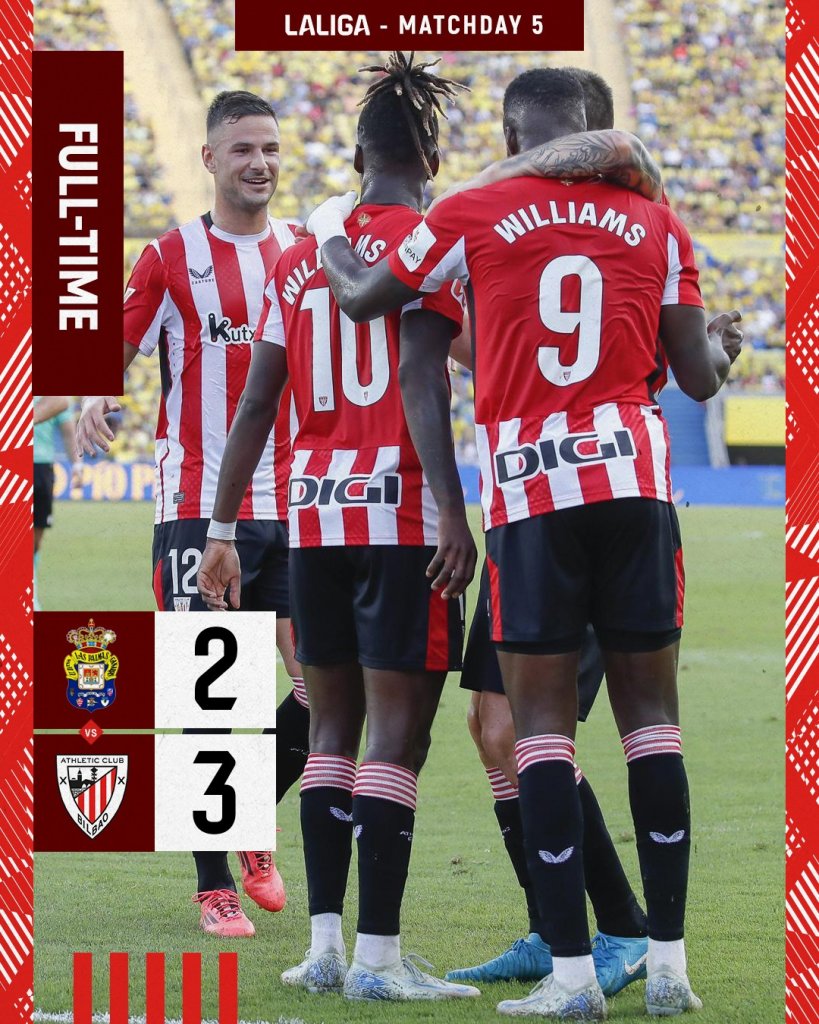 Μεγάλη νίκη για την Αθλέτικ Μπιλμπάο η οποία με χατ-τρικ του Ινιάκι Γουίλιαμς σε ασίστ κέρδισε με 3-2 την Λας Πάλμας. Με δέκα παίκτες από το 56΄ αγωνίστηκε η ομάδα του Ερνέστο Βαλβέρδε.