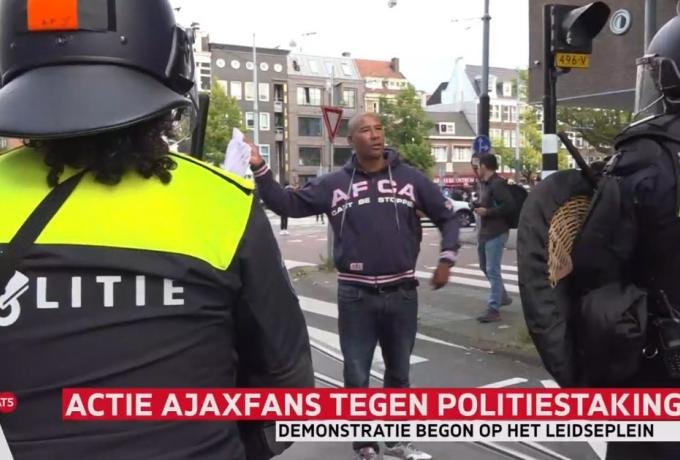 Στην πλατεία Λέιντσεπλεϊν, εκατοντάδες οπαδοί του Άγιαξ διαδήλωσαν, την Κυριακή, για την απόφαση των αστυνομικών του Άμστερνταμ να κατέβουν σε απεργία.