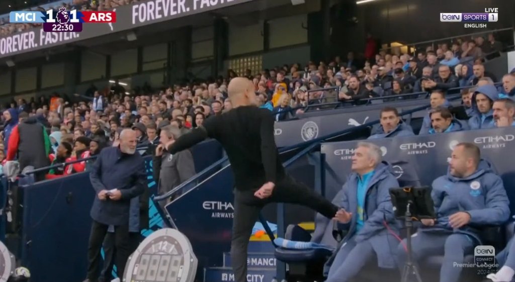 Με ένα πανέμορφο σουτ του Καλαφιόρι η Άρσεναλ ισοφάρισε, στο 22ο λεπτό, τη Σίτι σε 1-1. Το γκολ εξόργισε τον Πεπ Γκουαρδιόλα που ξέσπασε στον πάγκο κλοτσώντας μια από τις πολυθρόνες.