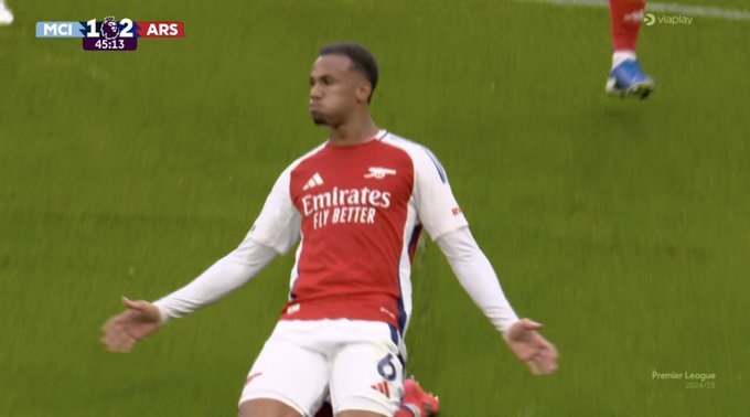 Ανατροπή για την Άρσεναλ μέσα στο «Έτιχαντ»! Στο 45+1’ ο Σάκα εκτέλεσε το κόρνερ από τα δεξιά, με τον Γκάμπριελ Μανγκαλάες να κάνει ένα τρομερό άλμα και να κερδίσει την άμυνα της Μάντσεστερ Σίτι στον αέρα για το 1-2 των «κανονιέρηδων».