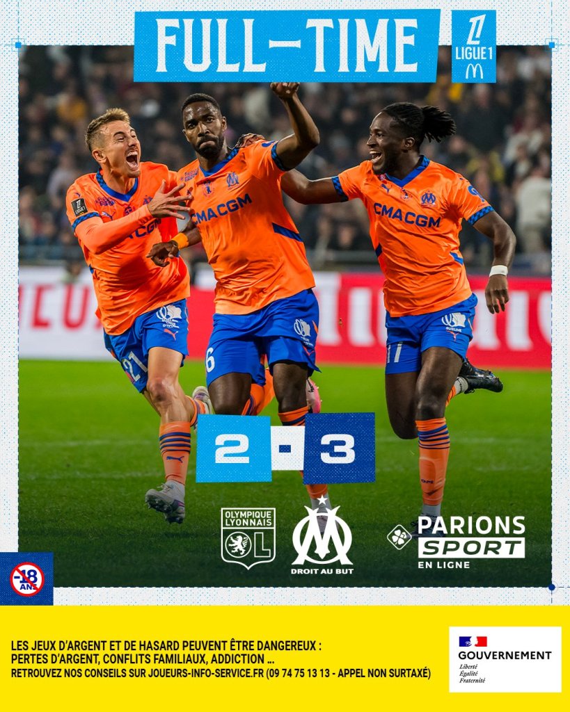 Σε αναμέτρηση ακατάλληλη για καρδιακούς η φοβερή και τρομερή Μαρσέιγ του Ρομπέρτο Ντε Τσέρμπι παρά το γεγονός πως έπαιζε με παίκτη λιγότερο από το 5' πήρε απίθανη νίκη με 3-2 στην έδρα της Λιόν με γκολ στο 90+6' και ενώ είχε ισοφαριστεί δύο λεπτά νωρίτερα. Πάτησαν κορυφή και συγκατοικούν με την Παρί οι απίθανοι Μασσαλοί.