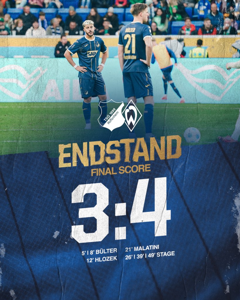 Με ανατροπή έπος πέρασε η Βέρντερ Βρέμης από την έδρα της Χόφενχαϊμ με 4-3. Οι φιλοξενούμενοι δέχθηκαν σφυροκόπημα στο πρώτο τέταρτο βρισκόμενοι με 3-0 πίσω στο σκορ ωστόσο η αποβολή του Ενσόκι άλλαξε τα δεδομένα. Η Βέρντερ αντέδρασε και αφού κατάφερε να ισοφαρίσει πριν φύγει το ημίχρονο βρήκε και γκολ ανατροπής με τον Στάγκε ο οποίος έκανα χατ τρικ.