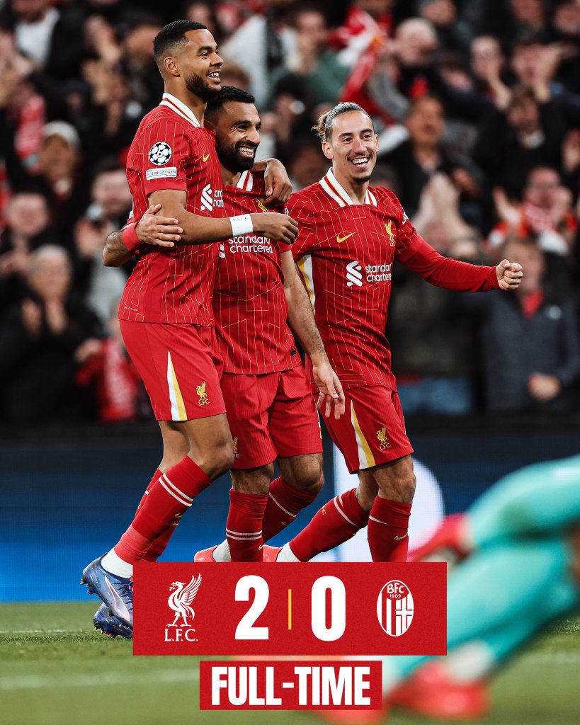 Έκανε το δύο στα δύο η Λίβερπουλ η οποία χωρίς να εντυπωσιάσει κάνοντας τα βασικά κέρδισε 2-0 την αξιόμαχη Μπολόνια. Πολλές χαμένες ευκαιρίες για τις δύο ομάδες στο πρώτο ημίχρονο. Δύο δοκάρια για τους φιλοξενούμενους με τον Εντόι ανάμεσα σε αυτές. Την επόμενη αγωνιστική οι κόκκινοι θα ταξιδέψουν στην Γερμανία και την έδρα της Λειψίας, ενώ η Μπολόνια θα μείνει στην Αγγλία και θα παίξει κόντρα στην Άστον Βίλα.