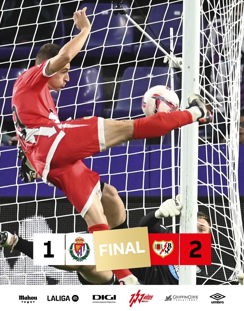 Πολύ κοντά στη πρώτη εξάδα, που εξασφαλίζει ευρωπαϊκό εισιτήριο, βρίσκεται η Ράγιο Βαγιεκάνο, μετά το διπλό στο "Jose Zorilla". Με πρωταγωνιστή έναν πρώην της Βαγιαδολίδ, τον Ντε Φρούτος, που σκόραρε δυο φορές, η ομάδα του Ινίγκο Πέρεθ νίκησε 2-1 και υποχρέωσε τη Βαγιαδολίδ σε όγδοο διαδοχικό ματς χωρίς τρίποντο.