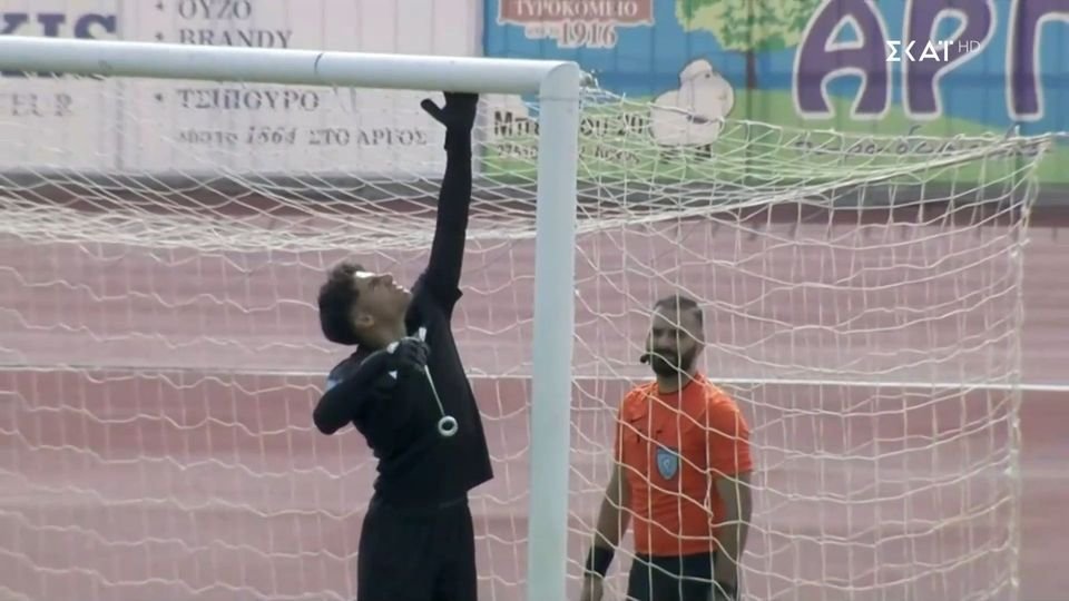 Στην εστία των γηπεδούχων το δίχτυ είχε σκιστεί κι έτσι ο τερματοφύλακας του Παναργειακού, ο Καραργύρης, πήρε ταινία για να το κολλήσει στην εστία, υπό το βλέμμα του βοηθού διαιτητή.
