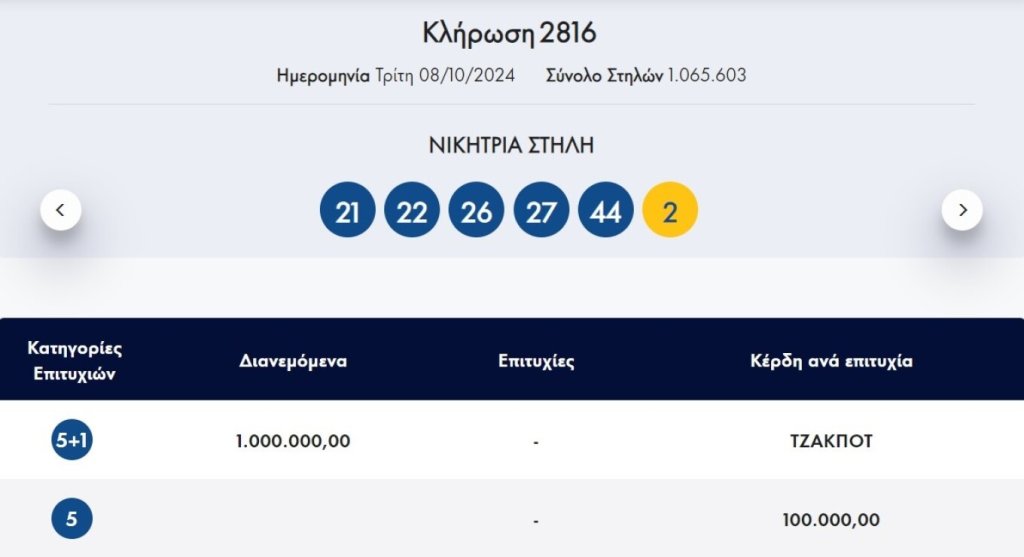 Οι αριθμοί που κληρώθηκαν είναι οι 21, 22, 26, 27, 44 και τζόκερ ο 2.