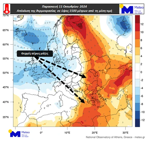 Στους Χάρτες 1 και 2 του meteo παρουσιάζεται η απόκλιση της θερμοκρασίας σε ύψος περίπου 1500 μέτρων από την μέση τιμή της περιόδου 1979-2010 για το μεσημέρι της Τετάρτης και της Παρασκευής. Το ύψος των 1500 μέτρων χρησιμοποιείται για την μελέτη των θερμοκρασιακών μεταβολών στο κατώτερο μέρος της ατμόσφαιρας.