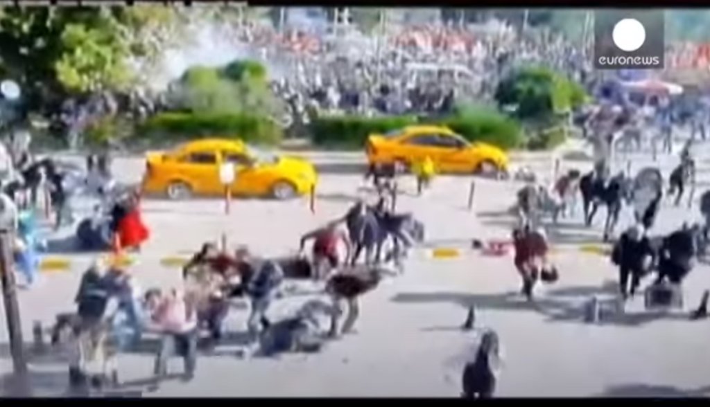 διπλή βομβιστική επίθεση στην Άγκυρα αφήνει 104 νεκρούς και πάνω από 400 τραυματίες με τα θύματα να κείτονται στο έδαφος καλυμμένα με αφίσες.