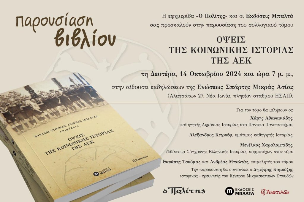 Η εφημερίδα «Ο Πολίτης» και οι Εκδόσεις Μπαλτά παρουσιάζουν, τη Δευτέρα, 14 Οκτωβρίου 2024 και ώρα 7 μ. μ., τον συλλογικό τόμο «Όψεις της κοινωνικής ιστορίας της ΑΕΚ». Η παρουσίαση θα πραγματοποιηθεί στην αίθουσα εκδηλώσεων της Ενώσεως Σπάρτης Μικράς Ασίας (Αλατσάτων 27, Νέα Ιωνία, πλησίον σταθμού ΗΣΑΠ).