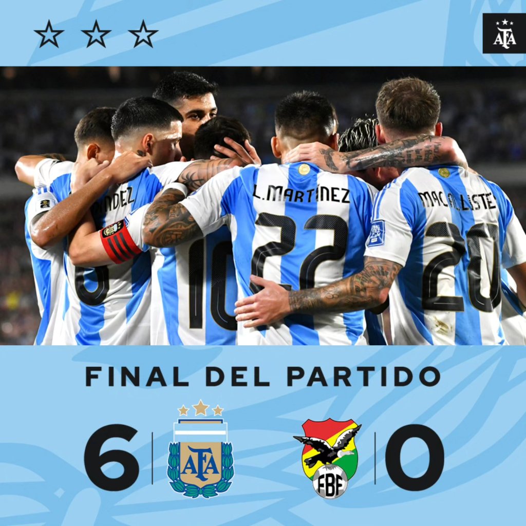 Με εμφατικό τρόπο και μεγάλο πρωταγωνιστή τον ηγέτη της, η Εθνική Αργεντινής επέστρεψε στις νίκες, στην προκριματική φάση του Παγκοσμίου Κυπέλλου, συντρίβοντας 6-0 την Βολιβία. Σε 93 λεπτά συμμετοχής, ο Λιονέλ Μέσι είχε τρία γκολ, δυο ασίστ, τέσσερα σουτ στον στόχο, 2/2 επιτυχημένες ντρίμπλες, 88 επαφές με την μπάλα και 4 πάσες-κλειδιά.