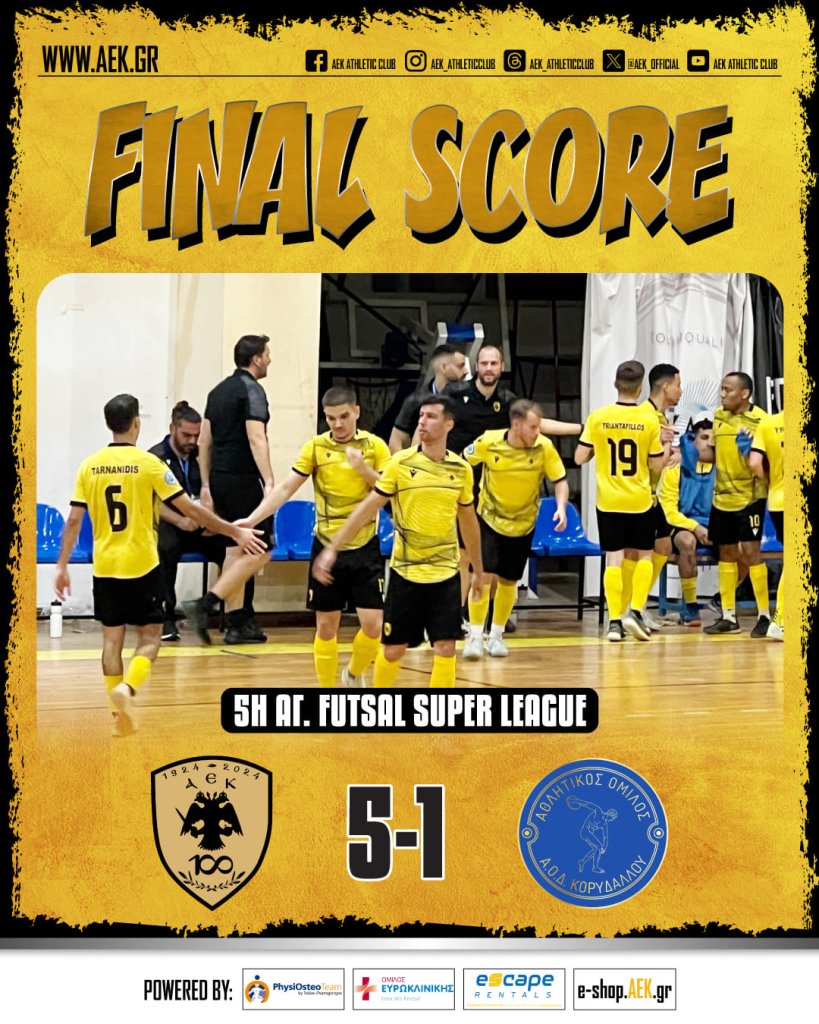 Η ΑΕΚ επικράτησε με 5-1 του Κορυδαλλού και έκανε το 5Χ5 στην Futsal Super League. Η ομάδα του Αγγέλου Εμμανουηλίδη δεν αντιμετώπισε κανένα πρόβλημα και έφτασε σε ένα εύκολο τρίποντο που την διατηρεί στην κορυφή του βαθμολογικού πίνακα.