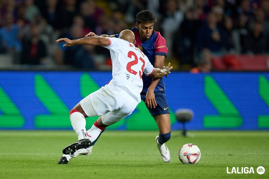 Στο 4ο λεπτό ο Γιαμάλ πέρασε ανάμεσα σε δύο παίκτες της Σεβίλλης κι έκανε το σουτ αλλά αστόχησε για λίγο ενώ μόλις έξω πέρασε και το σουτ του Λουκεμπάκιο στο 8’. Στο 16ο λεπτό το σουτ του Φάτι από καλό σημείο ήταν αδύναμο και στο 22’ η Μπαρτσελόνα κέρδισε πέναλτι και ο Λεβαντόφσκι έκανε το 1-0 από τα 11 μέτρα.