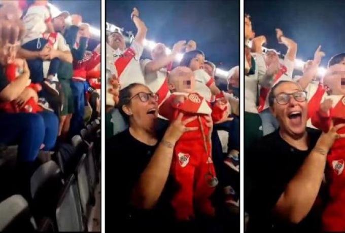 Le pide a la madre que lo suelte, suelta el chupete para "gritar el gol" de River y después está feliz