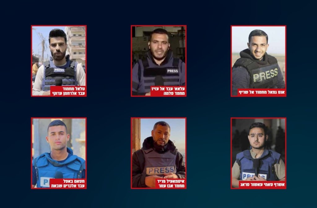 Τα ονόματα των δημοσιογράφων είναι ο Ανάς Αλ-Σαρίφ, ο Αλάα Σαλαμέχ, ο Χοσάμ Σαμπάτ, ο Ασράφ αλ-Σαράτζ, ο Ισμαήλ Αμπού Ομάρ και ο Ταλάλ αλ-Αρούκι.