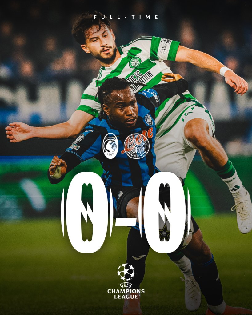 Η Σέλτικ έμεινε όρθια στο Μπέργκαμο, όπου απέσπασε λευκή ισοπαλία από την Αταλάντα και ανέβηκε στους τέσσερις βαθμούς, Έναν περισσότερο έχει η Dea. Η Αταλάντα την επόμενη αγωνιστική έχει δύσκολο εκτός έδρας ματς στη Στουτγκάρδη ενώ η Σέλτικ θα υποδεχτεί τη Λειψία.