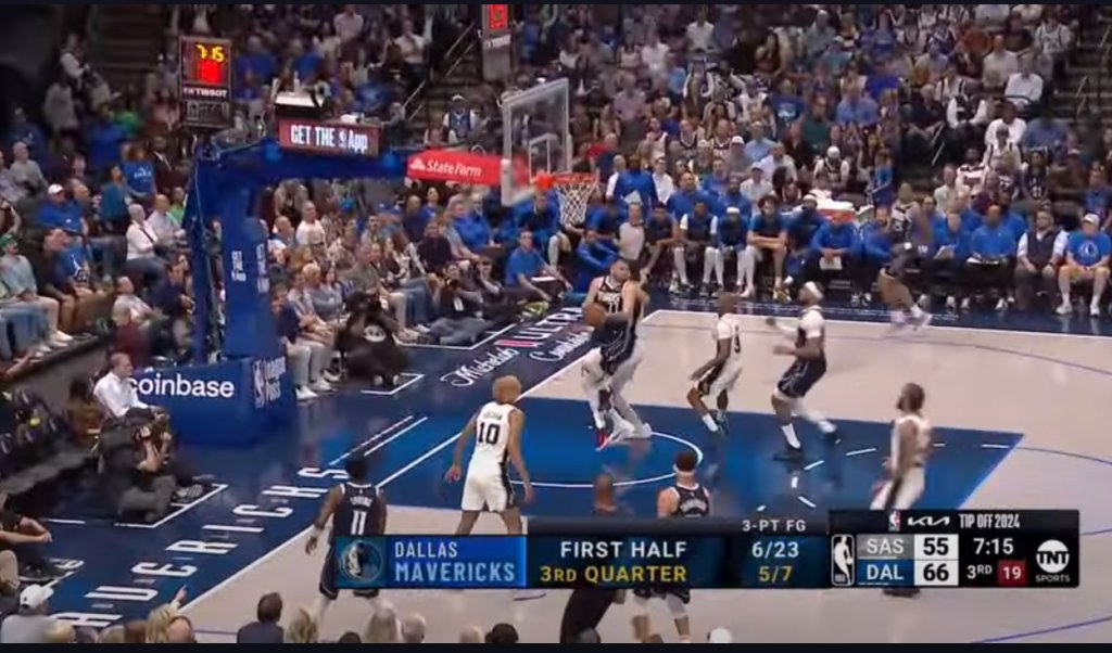 Στο ξεκίνημα της τρίτης περιόδου, ο Λούκα Ντόντσιτς όρμησε προς το καλάθι των Σαν Αντόνιο Σπερς, υπό το ασφυκτικό μαρκάρισμα του Βίκτορ Γουεμπανιαμά. Τότε, ο Σλοβένος γκαρντ των Ντάλας Μάβερικς, με μια αδιανόητη no look πάσα, βρήκε τον Πι Τζέι Γουάσινγκτον, ο οποίος ευστόχησε σε σουτ τριών πόντων.
