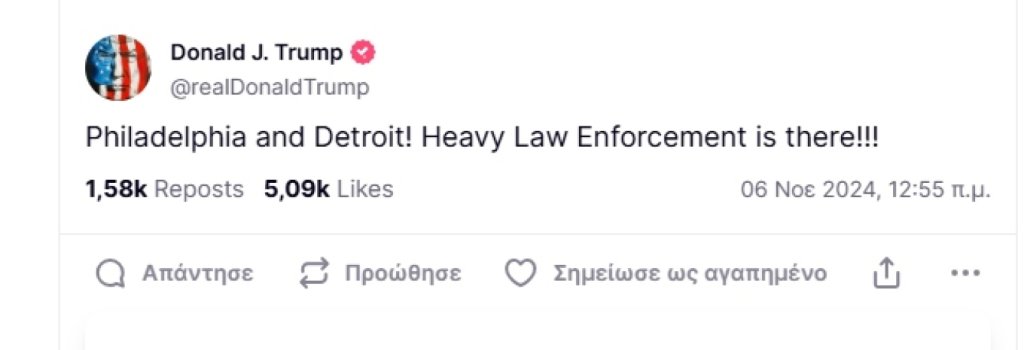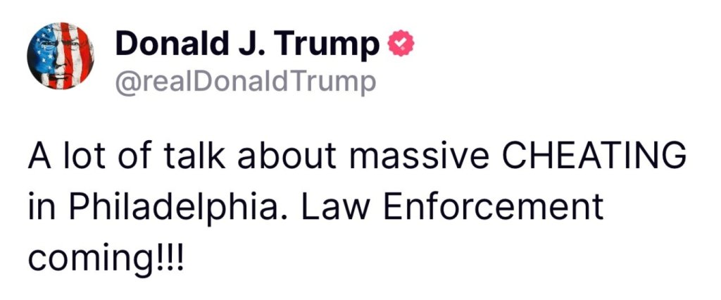 Αρχικά, με ανάρτησή του στο δικό του κοινωνικό δίκτυο, το Truth Social, μιλά για «μαζική νοθεία» που «ακούγεται» ότι στη Φιλαδέλφεια.