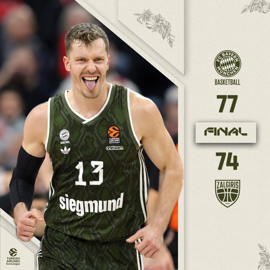 Η Ζαλγκίρις επέστρεψε από το -16 της τρίτης περιόδου (50-34), ωστόσο η Μπάγερν με τον Έντουαρντς να μιλάει στα κρίσιμα επικράτησε με 77-74 σε ματς θρίλερ. Πήγε να γυρίσει μόνος του το παιχνίδι η Φρανσίσκο (20π.), αποντος στο ευρωπαϊκό του ντεμπούτο στο Λόνι Ουόκερ (0/8σ.).