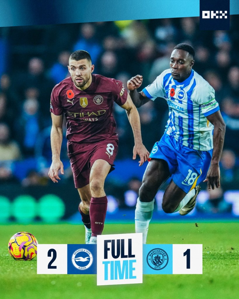 Πρωτόγνωρες καταστάσεις για τη Σίτι και τον Πεπ Γκουαρδιόλα. Οι «πολίτες» γνώρισαν οδυνηρή ήττα με 2-1 στην έδρα της Μπράιτον παρότι είχαν προηγηθεί και μετρούν πλέον τέσσερις διαδοχικές ήττες σε όλες τις διοργανώσεις.