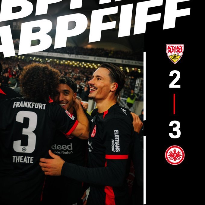 Πήρε τη ματσάρα η Άιντραχτ! Ο σύλλογος της Φρανκφούρτης, αν και πήγε να «αυτοκτονήσει» στα τελευταία λεπτά, κατάφερε να περάσει με 3-2 από την έδρα της Στουτγκάρδης, να πανηγυρίσει δεύτερο σερί τρίποντο και να εδραιωθεί στην πρώτη τριάδα της βαθμολογίας. Νέο απίθανο γκολ με εκτέλεση φάουλ από τον Ομάρ Μαρμούς, ο οποίος έγινε ο πρώτος παίκτης την φετινή σεζόν που πετυχαίνει 3 γκολ από στημένες φάσεις. Ακυρώθηκε γκολ για τους γηπεδούχους στο 90+7'.