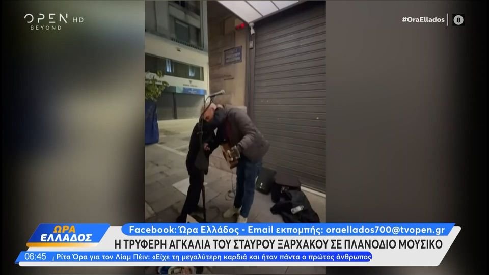 Ο κορυφαίος Σταύρος Ξαρχάκος ακούει με σεβασμό τον πλανόδιο μουσικό στην Βουκουρεστίου και έπειτα τον αγκαλιάζει.