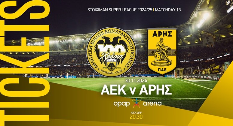 Η ΠΑΕ ΑΕΚ ανακοινώνει ότι αύριο Τετάρτη στις 16:00 θα αρχίσει η διάθεση των εισιτηρίων για το παιχνίδι της 13ης αγωνιστικής της Super League με τον Άρη, που θα διεξαχθεί το Σάββατο 30 Νοεμβρίου στις 20.30, στην OPAP Arena.