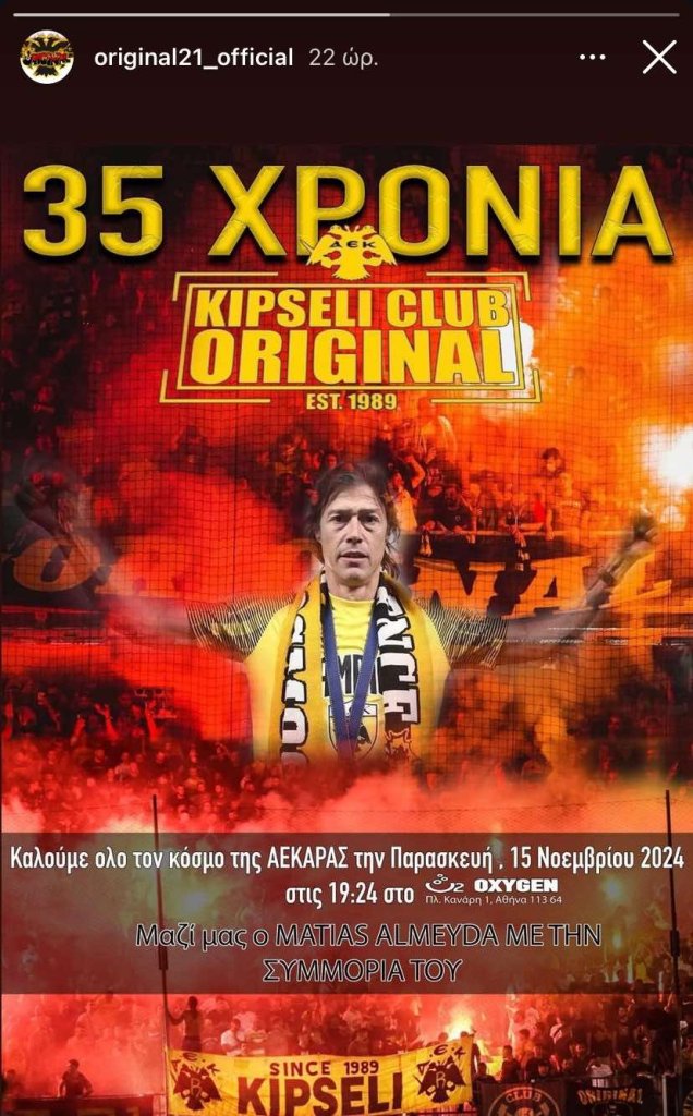 Την προσεχή Παρασκευή (15/11) το κλαμπ της ORIGINAL 21 στην Κυψέλη γιορτάζει τα 35 του χρόνια! Καλεσμένοι στην διοργάνωση, βέβαια, είναι όλοι οι οπαδοί της ΑΕΚ, ενώ το «παρών» θα δώσει και ο Ματίας Αλμέιδα.