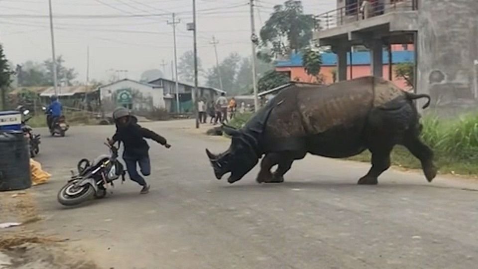 Τεράστιος ρινόκερος επιτέθηκε σε μοτοσικλετιστή στο Νεπάλ. Αν και υπό κανονικές συνθήκες οι ρινόκεροι ζουν ειρηνικά με τους κατοίκους της χώρας, ίσως σε αυτή την περίπτωση το μεγαλειώδες ζώο να εκνευρίστηκε με το μηχανάκι.