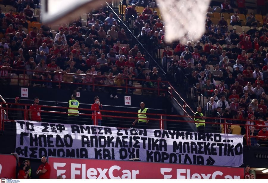 «Το ΣΕΦ άμεσα στον Ολυμπιακό... Γήπεδο αποκλειστικά μπασκετικό. Ισονομία και όχι κοροϊδία», αναφέρει χαρακτηριστικά το πανό των φίλων του Ολυμπιακού.